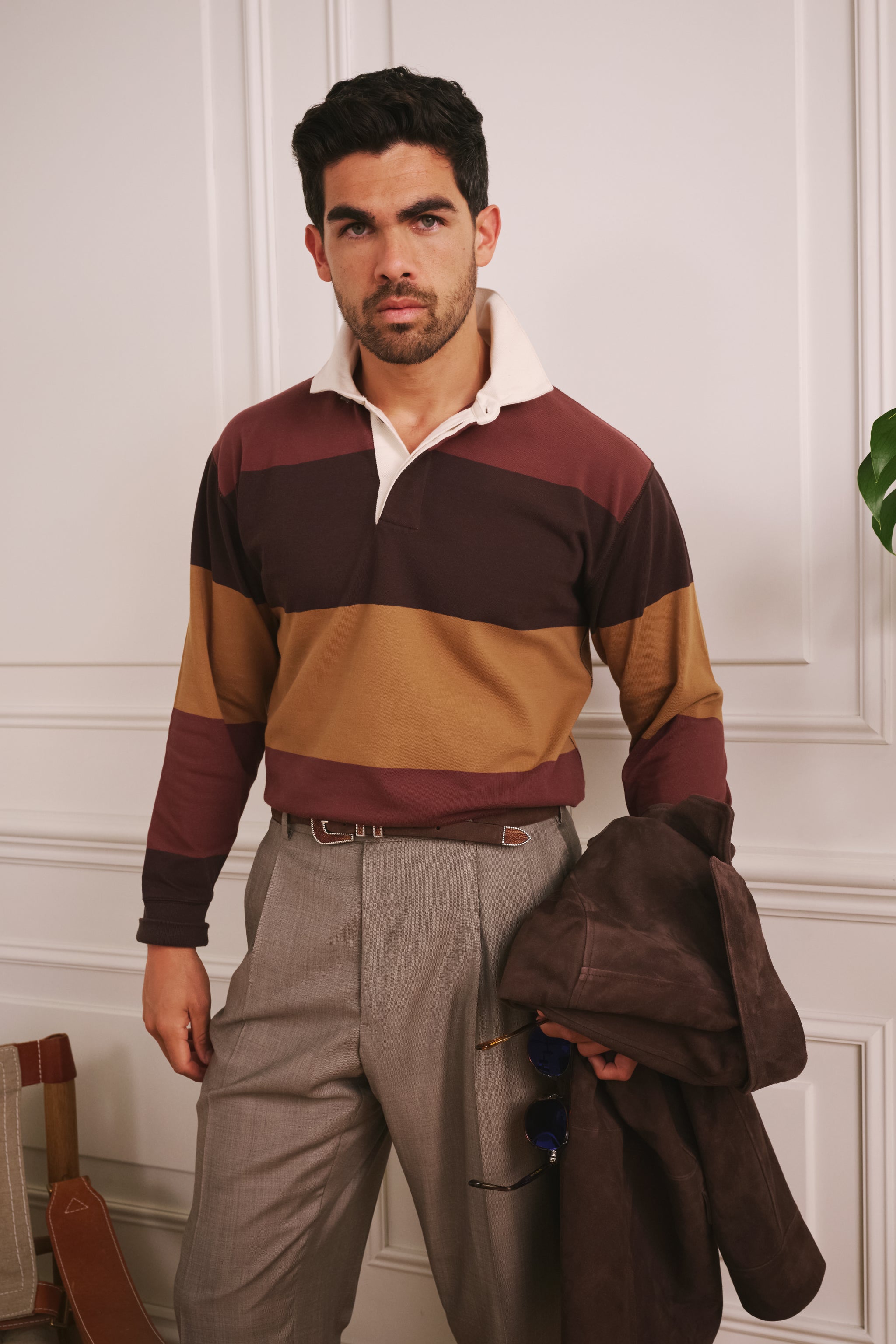 Crafted in Portugal from the finest cotton, it features bold yet balanced stripes in caramel, chocolate, and burgundy — a grounded palette that feels rich, versatile, and perfectly tuned for the cooler months. The collar lends structure and polish, while considered details — twill plackets, horn buttons, and soft knitted cuffs — elevate the shirt beyond its sporting roots.